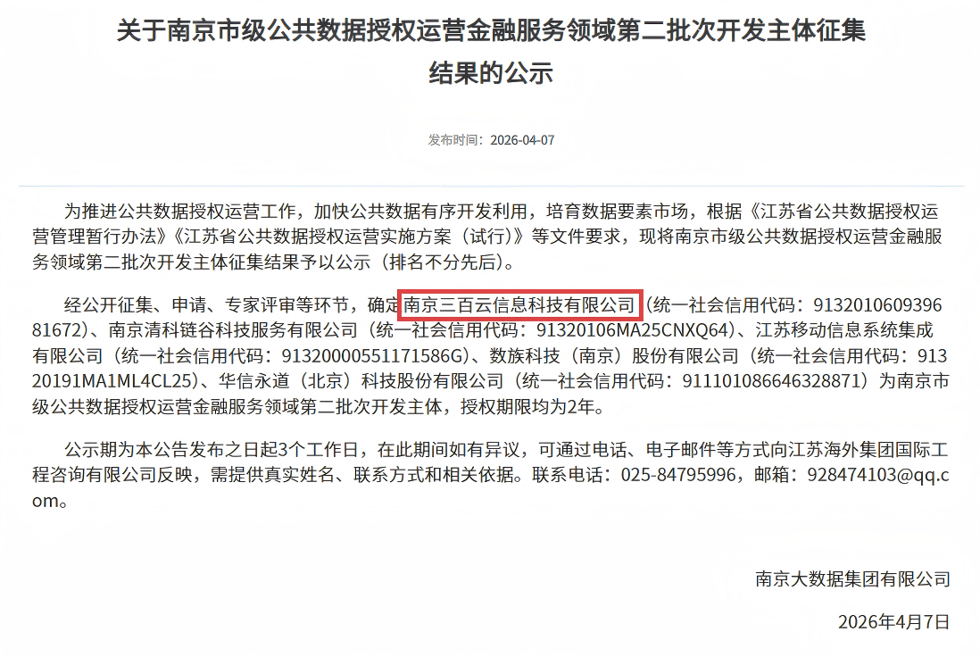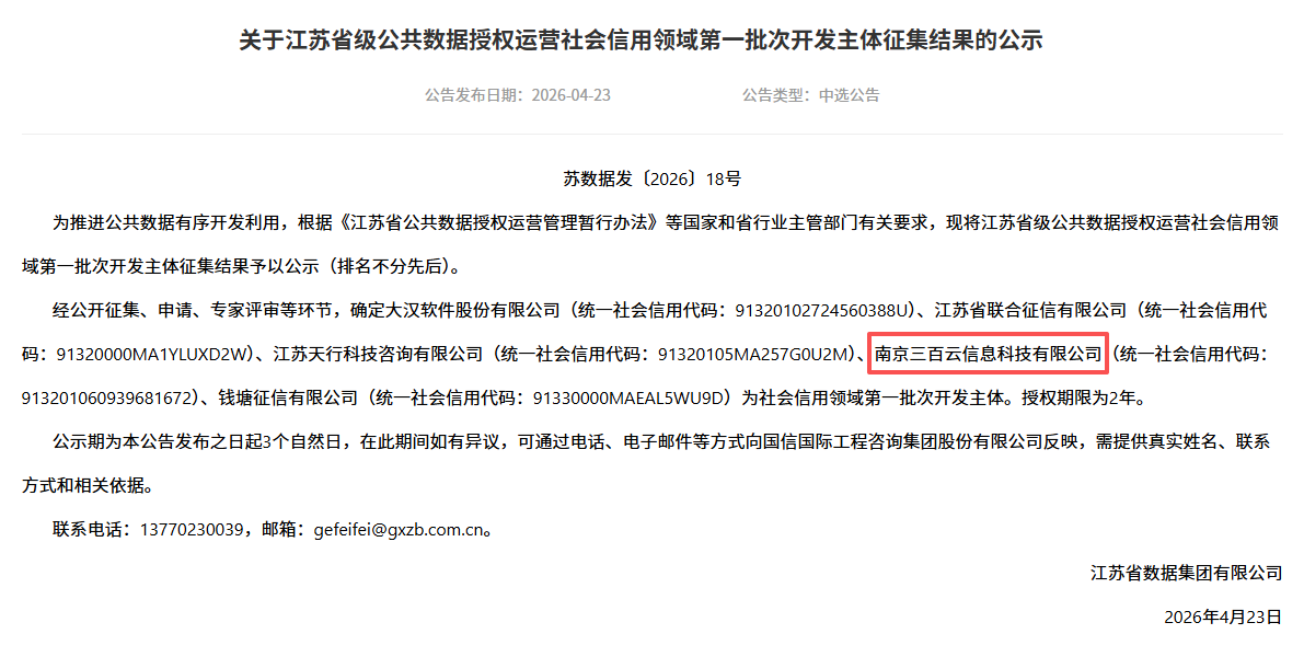 近日,江苏省数据集团有限公司、南京大数据集团有限公司分别发布省级、市级公共数据授权运营开发主体征集结果的公示,南京三百云信息科技有限公司成功入选江苏省级公共数据授权运营社会信用领域第一批次开发主体、南京市级公共数据授权运营金融服务领域第二批次开发主体。