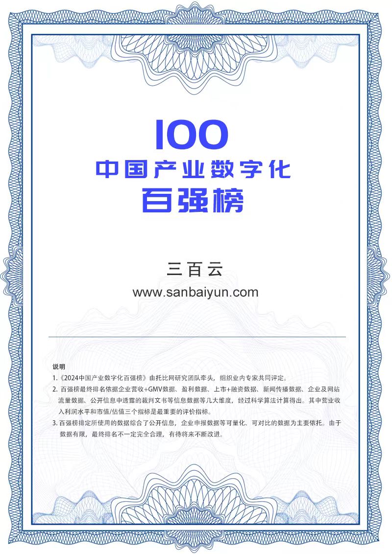 三百云凭借旗下平台车300在汽车行业的领先性蝉联“中国产业数字化百强榜”,并获评“ 2024中国产业数字化技术赋能先锋”。