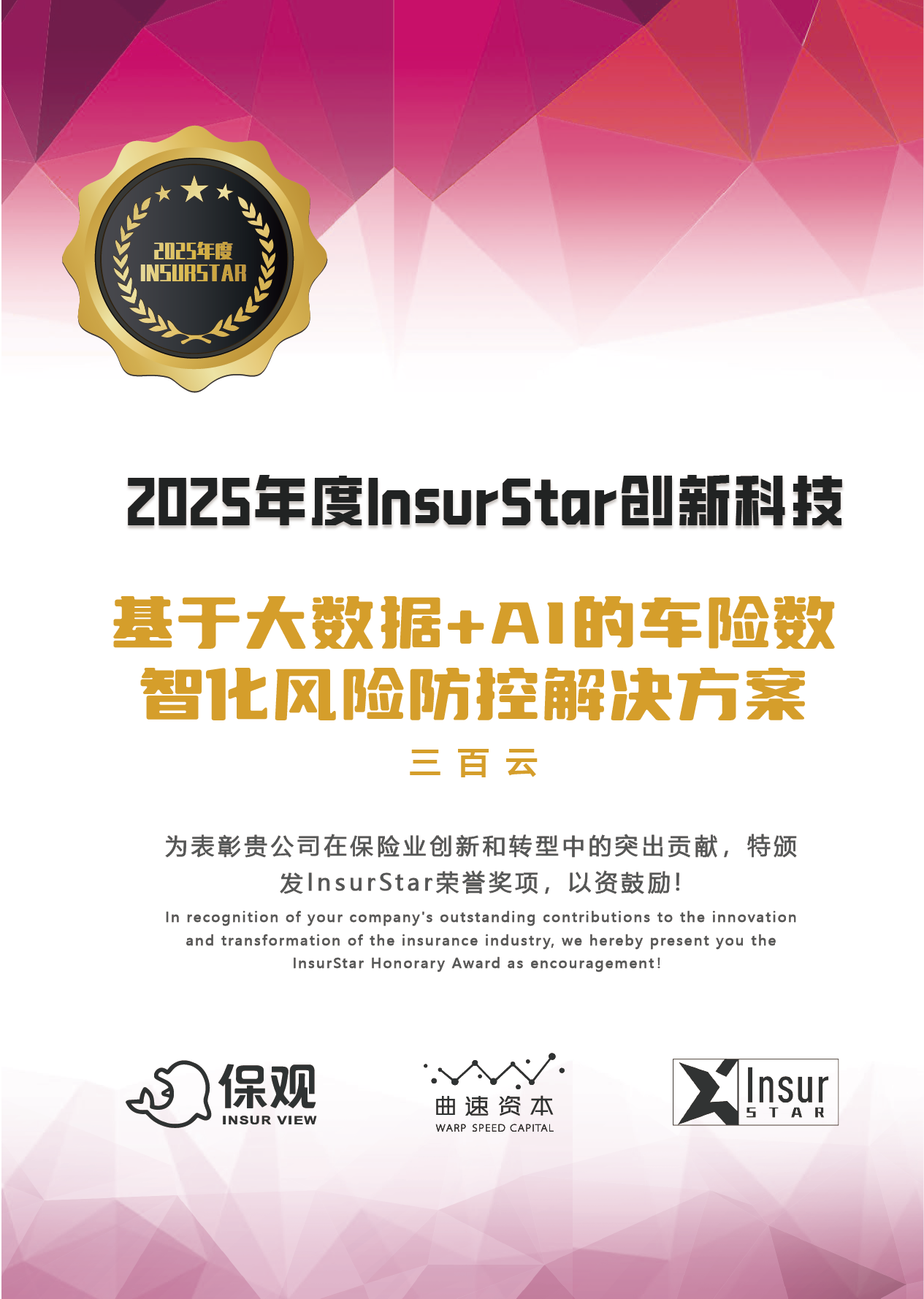 12月22日,由行业领先的保险科技新媒体“保观”发起的“2025年度InsurStar保险行业榜单”正式揭晓。经过多轮专业评审与激烈角逐,南京三百云信息科技有限公司(以下简称“车300”)凭借自主研发的“基于大数据+AI的车险数智化风险防控解决方案”,从200多家参选机构中脱颖而出,荣获“2025年度InsurStar创新科技”奖项。