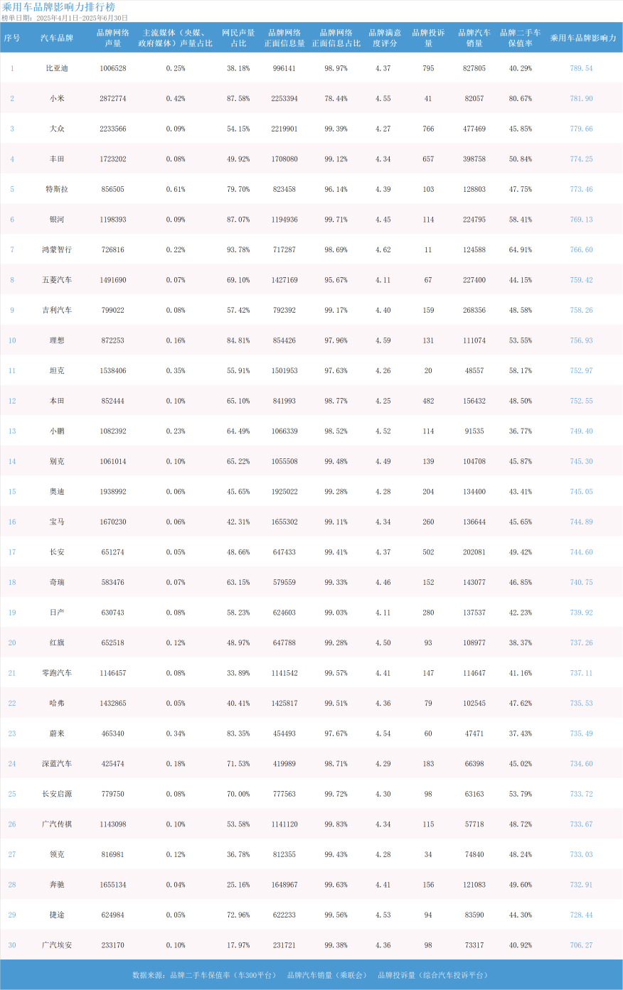 最新发布的2025年二季度榜单数据清晰揭示,比亚迪以颠覆性优势超越大众登顶乘用车榜首,而跨界科技巨头小米汽车更是上演“空降”奇迹,携首款SUV“YU7”创下18小时锁定订单超24万台的纪录,以黑马姿态强势占据榜单亚军;同时,鸿蒙智行作为全新面孔首次亮相便成功跻身乘用车影响力前十。本土新能源与科技品牌正以前所未有的势头重塑市场影响力版图,而传播声量与用户口碑的均衡提升已成为品牌决胜未来的核心能力。