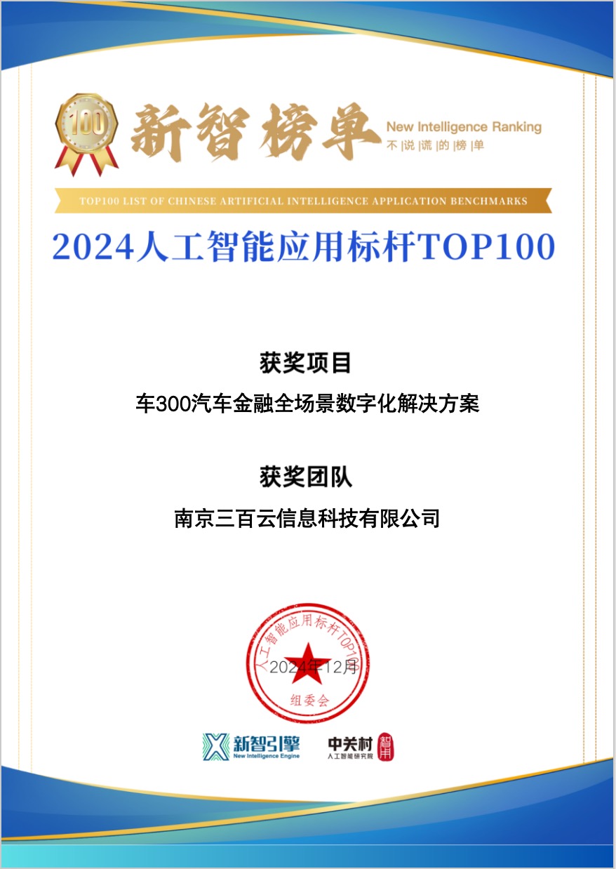 在智慧金融赛道,具有高价值、标杆性、真落地的行业典型应用——车300汽车金融全场景数字化解决方案,入选“人工智能应用标杆TOP100”。