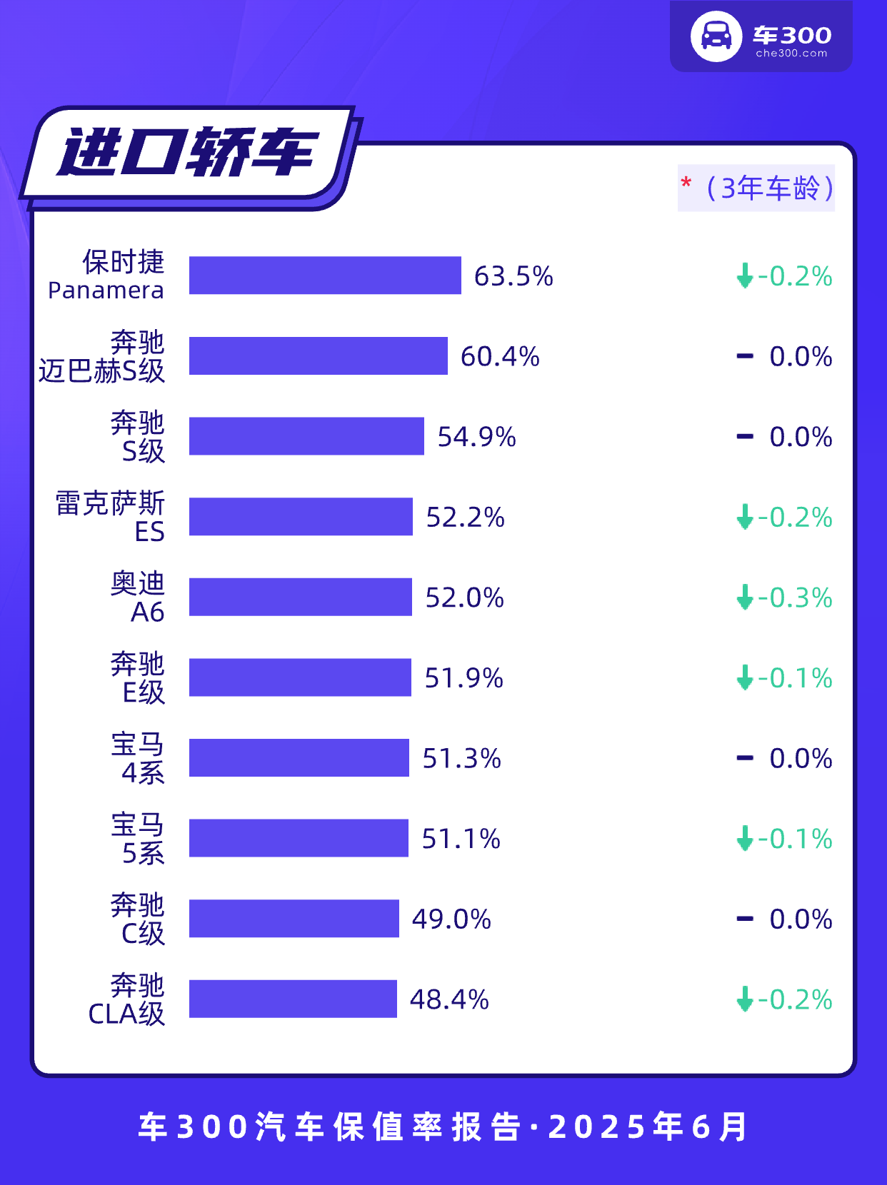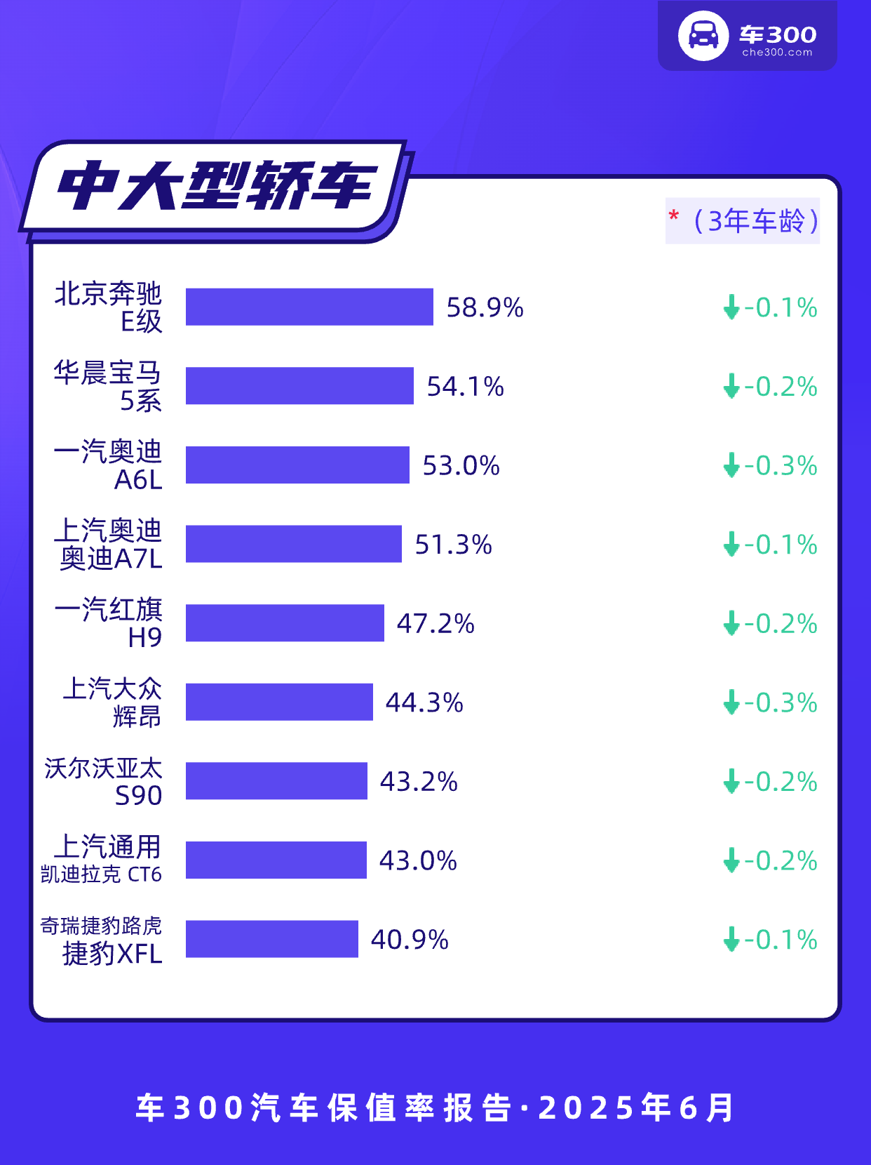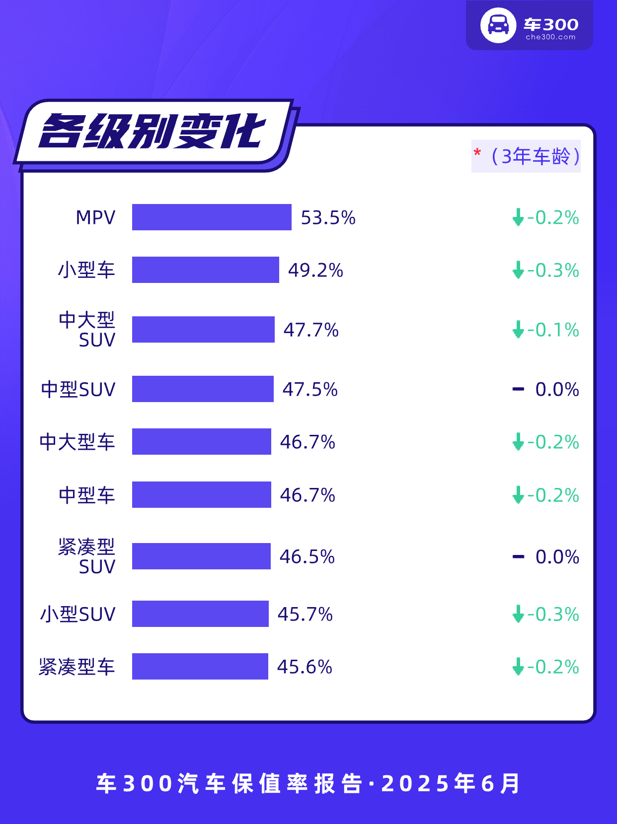 6月汽车保值率延续普跌趋势,各级别环比降幅在0.1%~0.4%之间。