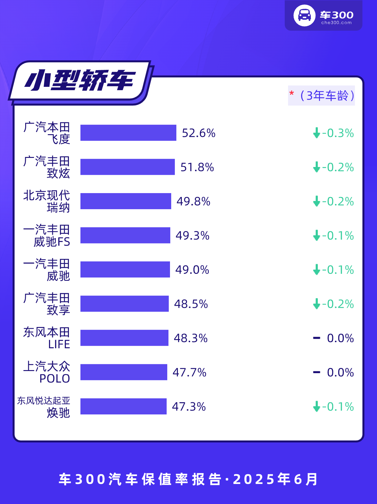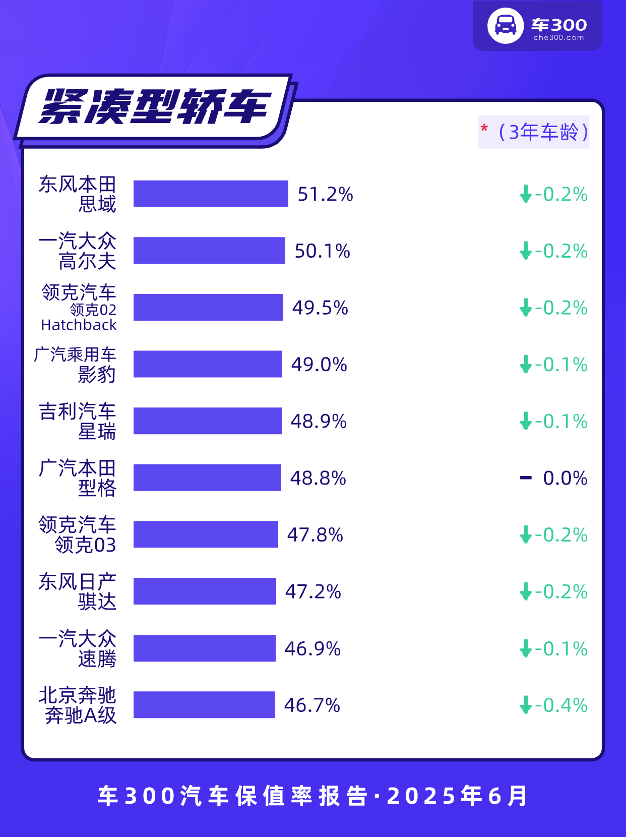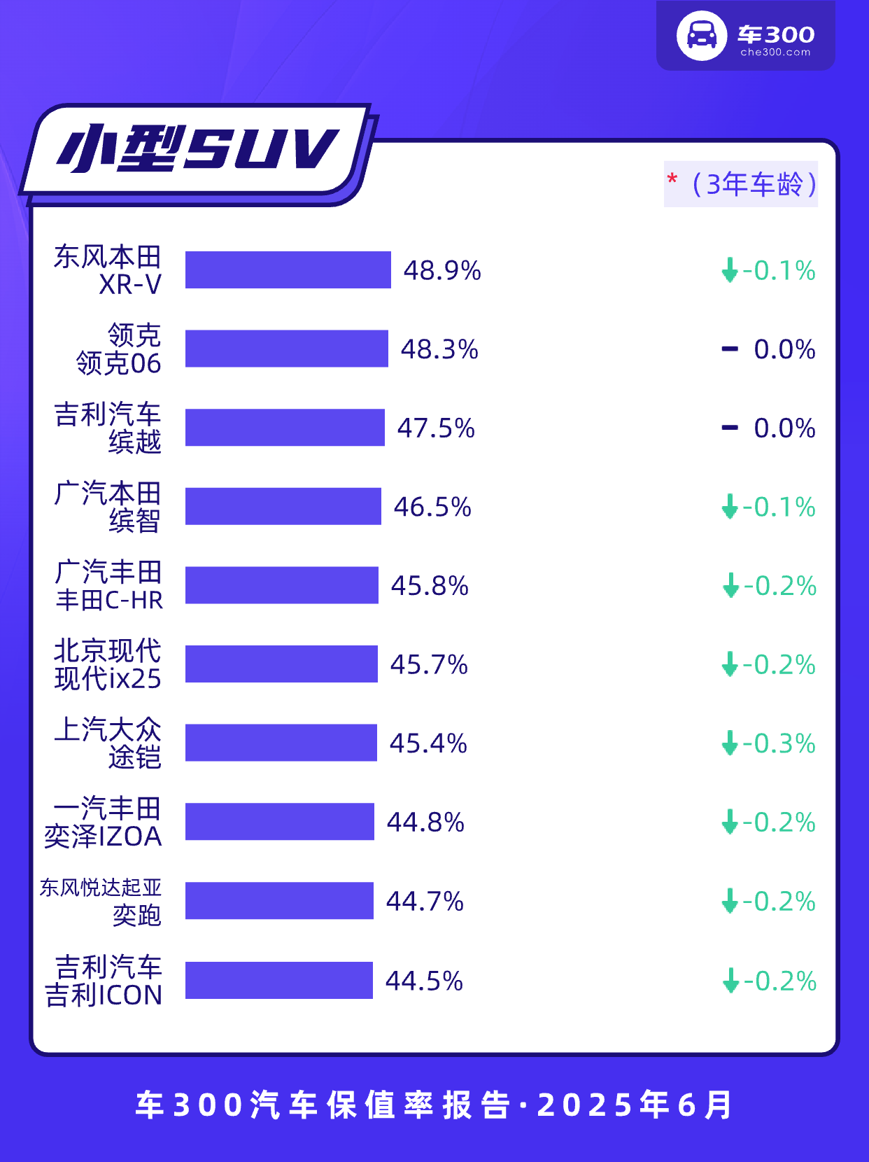 紧凑型SUV坦克300(63.8%)稳居榜首,奔驰GLB级(48.7%,降0.3%)跌幅突出,豪华品牌估值理性回归。小型SUV面临严峻挑战,XR-V(48.9%)勉强领跑。