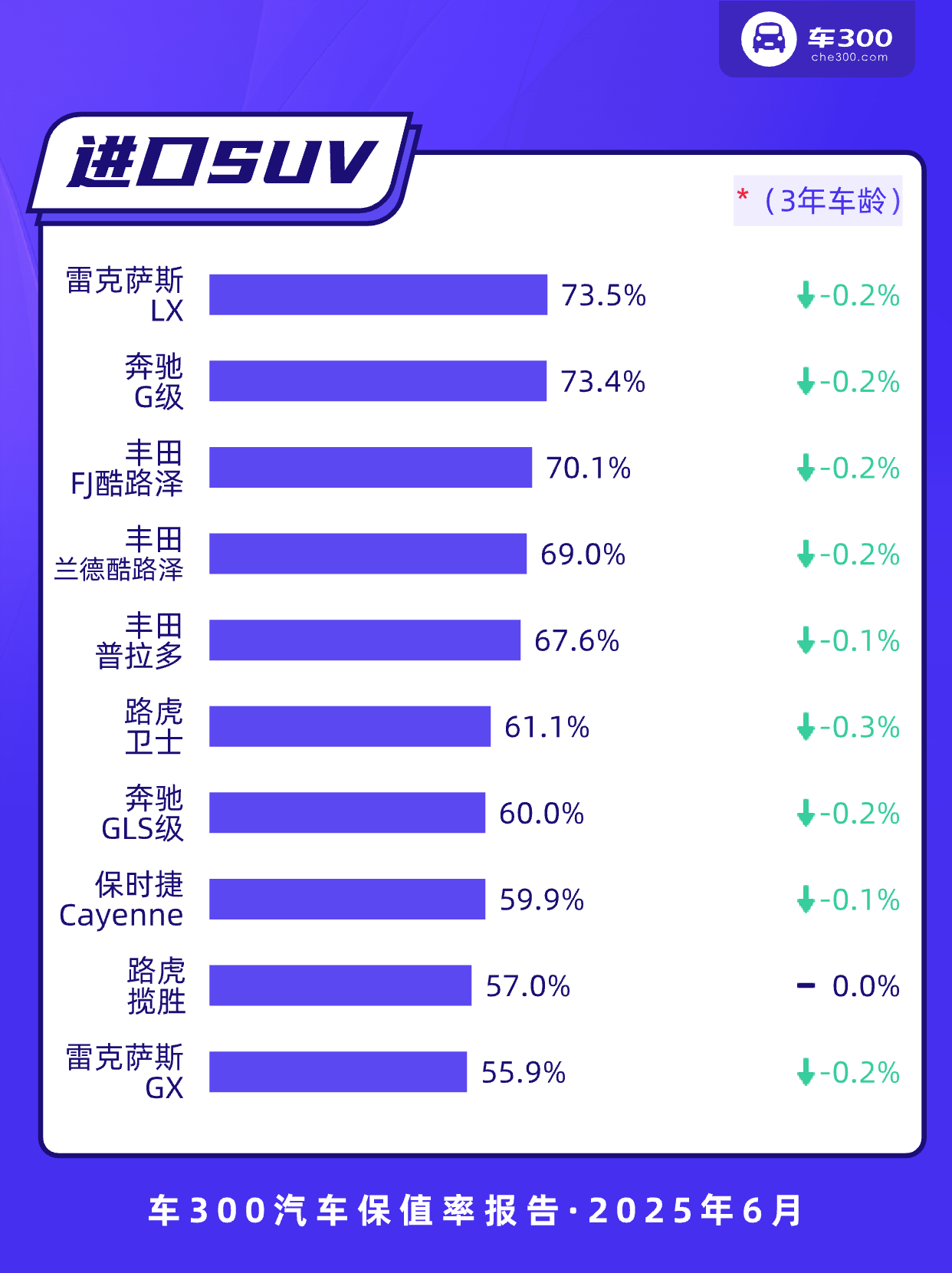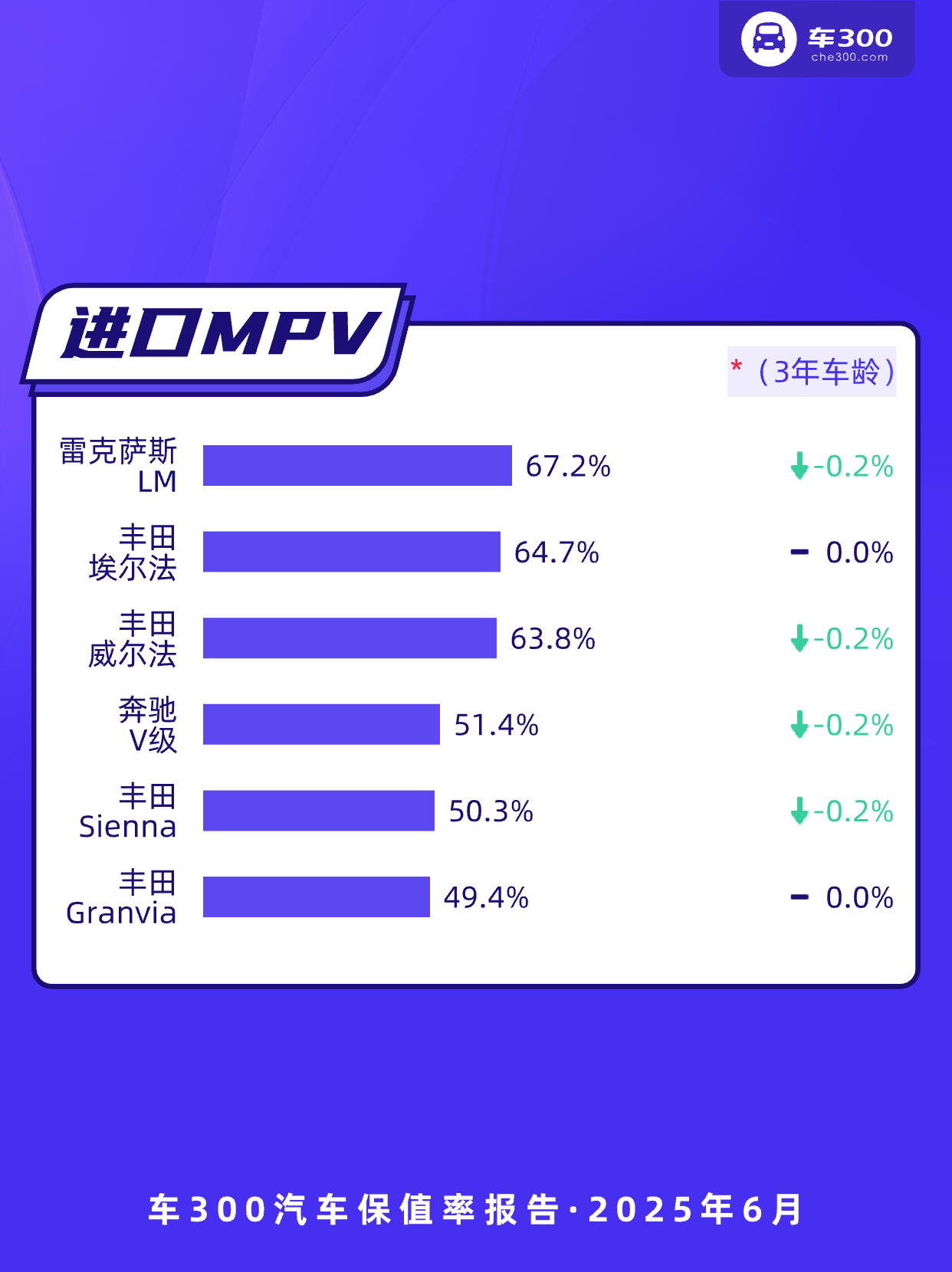 中型SUV保值率整体小幅下滑,市场需求较为稳定,皇冠陆放(56.7%)稳居榜首。中大型SUV普拉多(70.5%)与进口SUV雷克萨斯LX(73.5%)凭越野稀缺性筑高壁垒,但中西部山区偏好燃油,东部平原倾向电动,区域需求分化加剧。农民工回流进一步强化“北强南弱”格局。