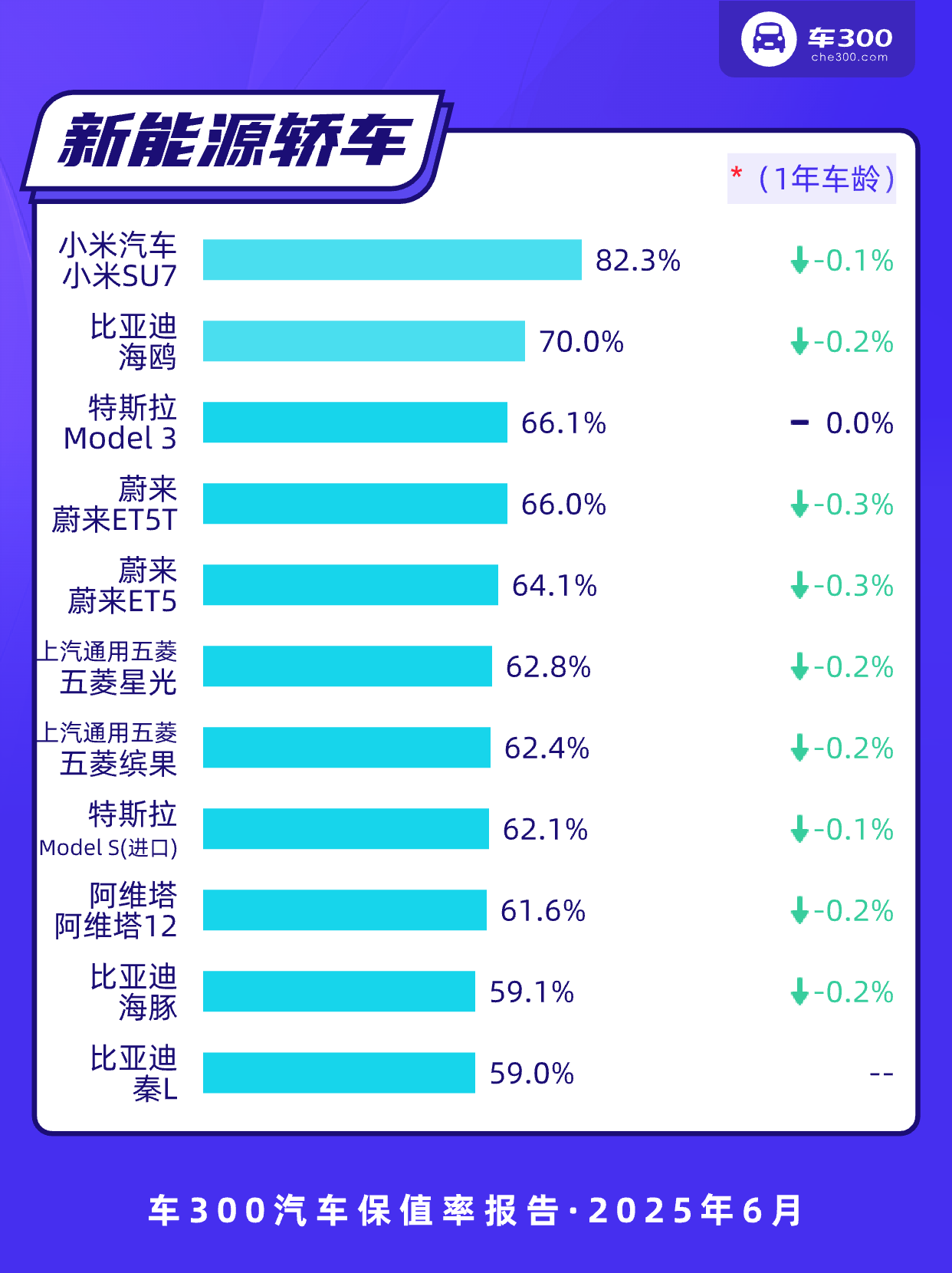 保时捷Panamera以63.5%保值率居进口轿车首位,尽管今年在华新车销量表现不佳,但市场认可度依旧,二手车保值率表现相对稳健。新能源轿车明星产品小米SU7(82.3%)领跑,蔚来ET5系列因终端优惠扩大导致保值率下滑0.3%,反映价格战对二手市场的传导效应。