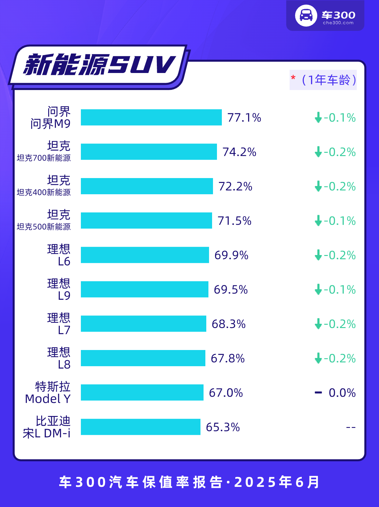 新能源SUV问界M9(77.1%)、坦克全系以插混技术解决高油耗痛点,同时在北方低温环境替代老旧纯电车型优势凸显。但比亚迪降价潮引发二手市场估值体系松动。